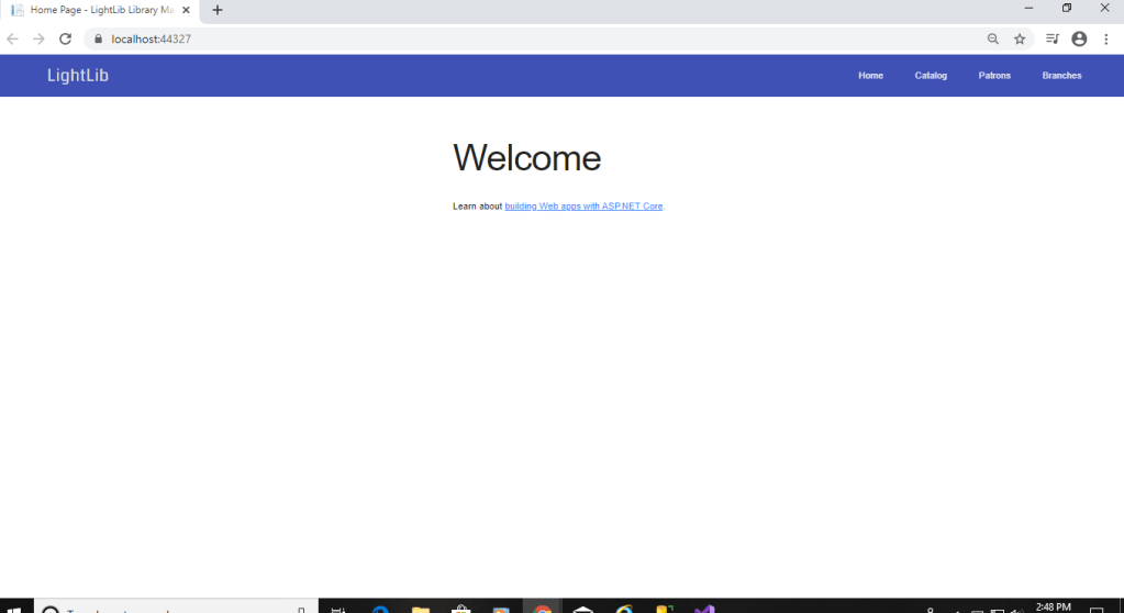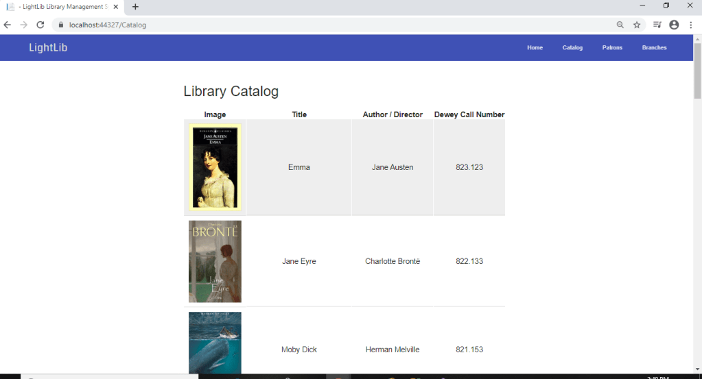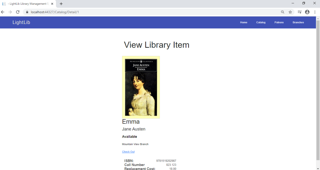 In the first photo is now what it looks like when you first debug it in Visual Studio. Now, instead of having to /Catalog to get there, you can just click Catalog in the top right. It will bring to the second photo which i figure out how to get the photos there so it looks pretty good right now. The third page will show up if you click any of the books. It will bring you to the third photo where you can view the ISBN, Call Number, and Replacement Cost if lost. I added a Detail view page to make this how it it. It is coming together nicely. I also changed the _Layout html page to some javascript designs and fonts.