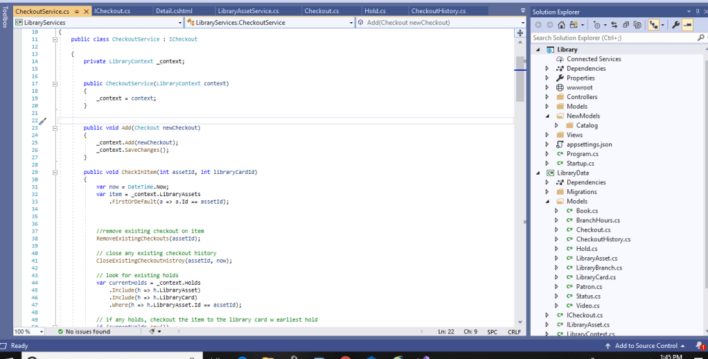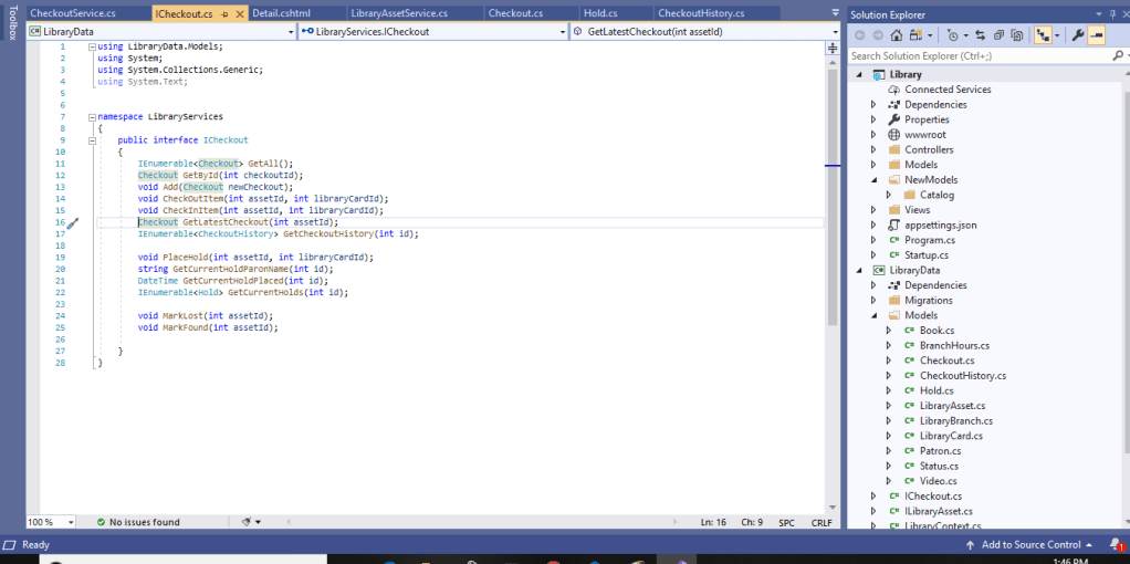 For this weeks update i did not add anything new to the database. My main focus right now is making the checkout features work. These features include checking the book out with your library card, checking to see if it checked out, any holds on the book, latest checkout history and so on. There was a lot of code this week to attempt to implement these features. In the first photo, i added another interface called “ICheckout.” This interface has all the classes, strings, etc necessary for the checkout process. Once this was created, i implemented this interface into my “CheckoutServics” cs file. This in turn generates the code from the ICheckout interface. Essentially what this did was inherit from the interface. The second photo shows the beginning of the code. The commands basically pull information from the database and will give the user a workable checkout process. The third photo shows you what happens when you check out an item and see if there are any holds. There is still a lot more to add but this is my weekly update!