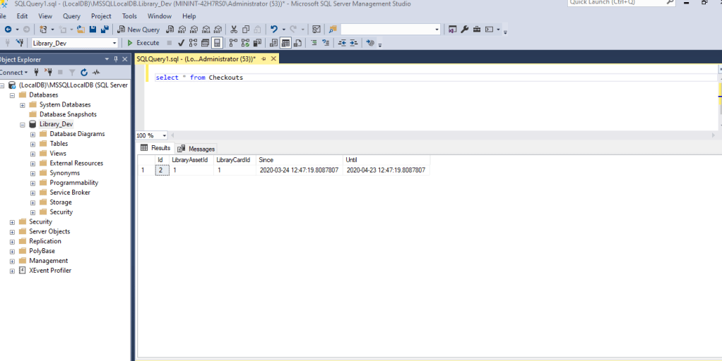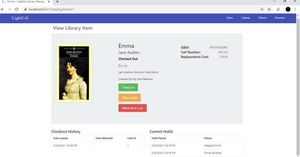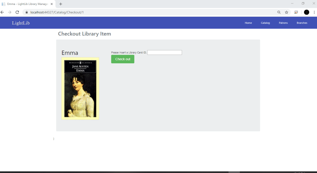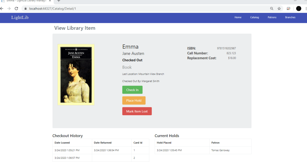 Since my last update, i did not have the Checkout button or the Place hold button wired up. What i did first was create more IActionResults in the CatalogController. These include CheckIn, Hold, MarkLost, MarkFound, PlaceCheckout, and PlaceHold. All of these controllers are essential to the process of checking out. The first photo shows what the Checkout page looks like. There you can put the ID of the Patron in and select Check Out. In the next photo you can see it is checked out now by Jane Patterson and the button is now Check In instead of Check Out. Now, to make sure this updated the database, i just ran a simple query which you can see in photo 3. This will show when the book was checked out and the ID’s of the Patron. In the 4th photo, down to the right you can see two Patrons who have placed a hold. It is the same process as checking out. You give your ID and you are added to the list. Now when Jane Patterson returns the book and you click “Check In,” the book automatically checks out to the person with the most recent hold. Which you can see in photo 5 is Margaret Smith. My next step is to get the Mark Item Lost button working and possibly update the Patron Page.